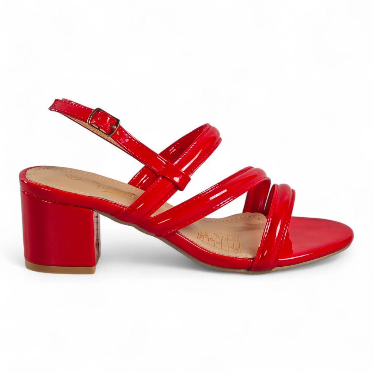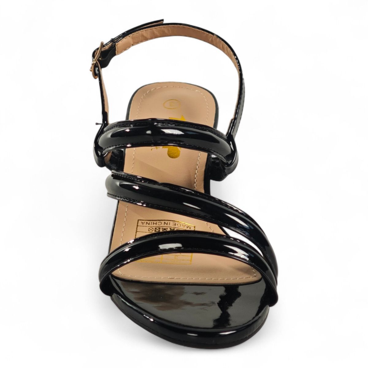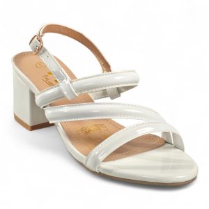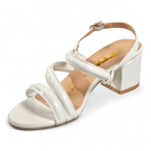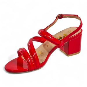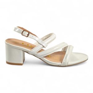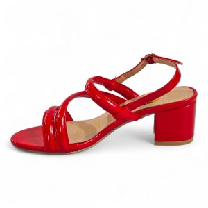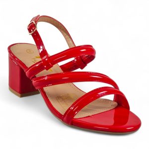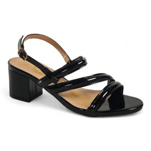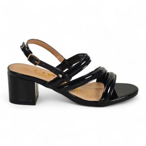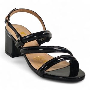 A glossy strappy sandal that combines sculpted block-heel stability with feminine, minimalist straps for polished evening or daytime looks.