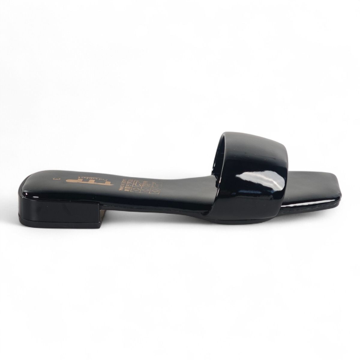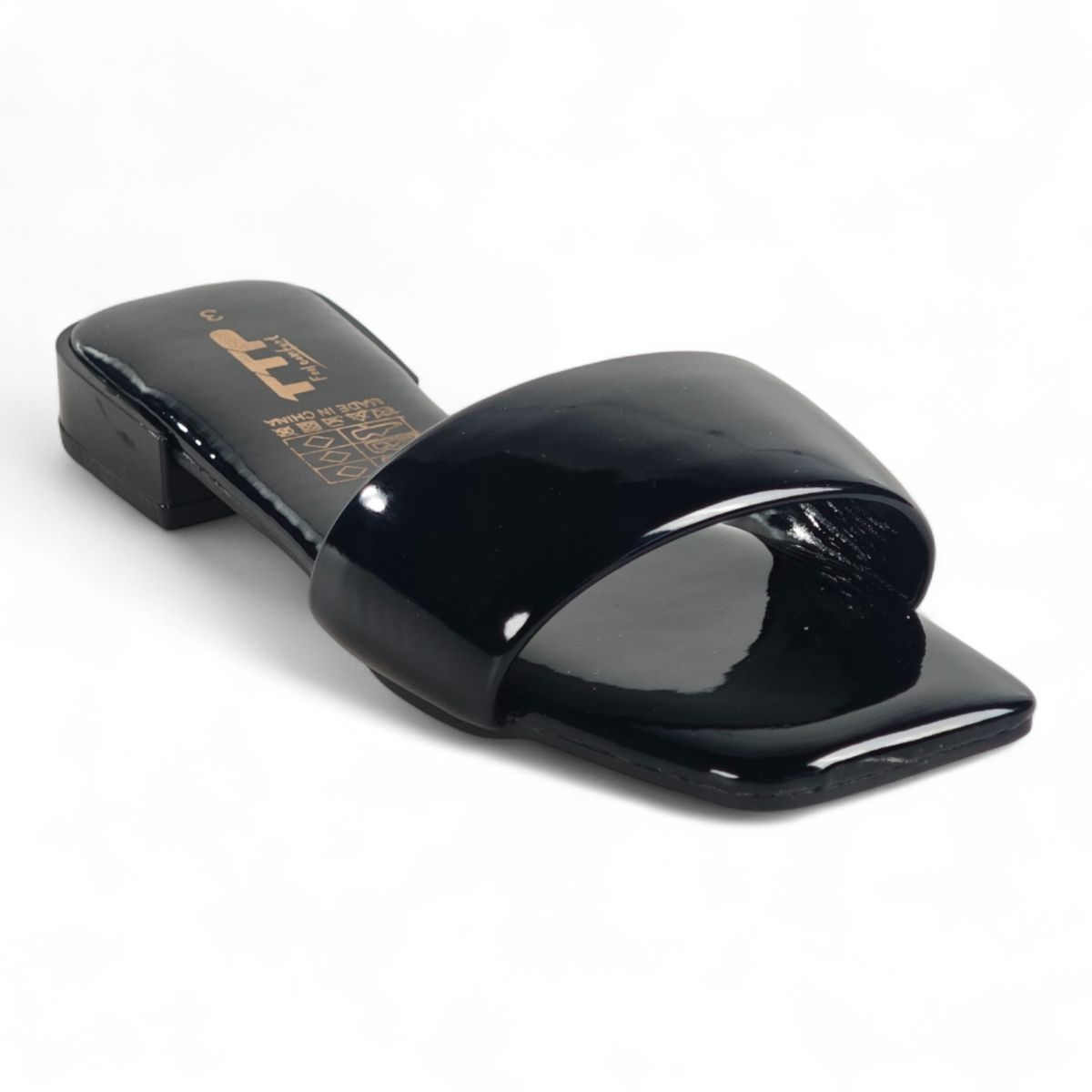 Sleek, modern slides with a square toe and wide glossy strap, crafted from durable PU with a cushioned PU+EVA insole and hard-wearing PVC outsole. Minimalist luxe for everyday wear and dress-up moments.